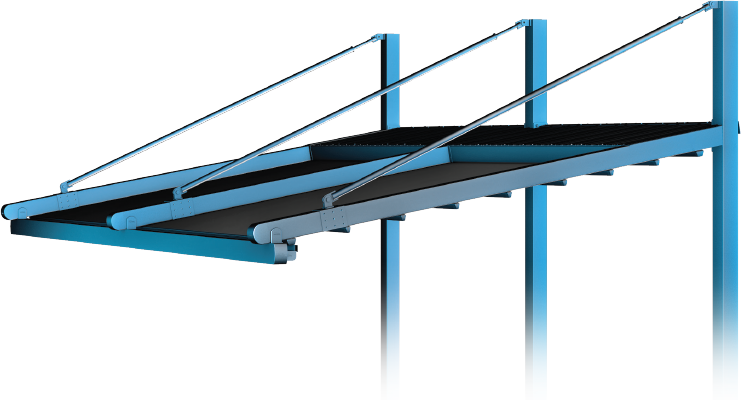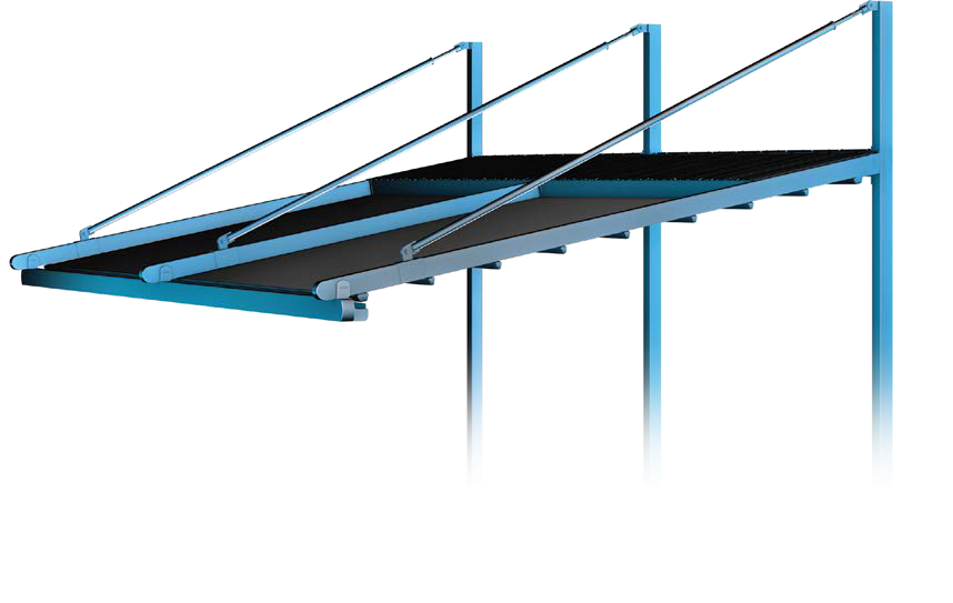 A különálló első, vízszintes gerenda tartja a tetőszerkezet teljes súlyát, mentesítve a csatornát a nyomás alól. Ezen kívül ez a profil tartja az üveg szerkezet és az oldal árnyékolókat.