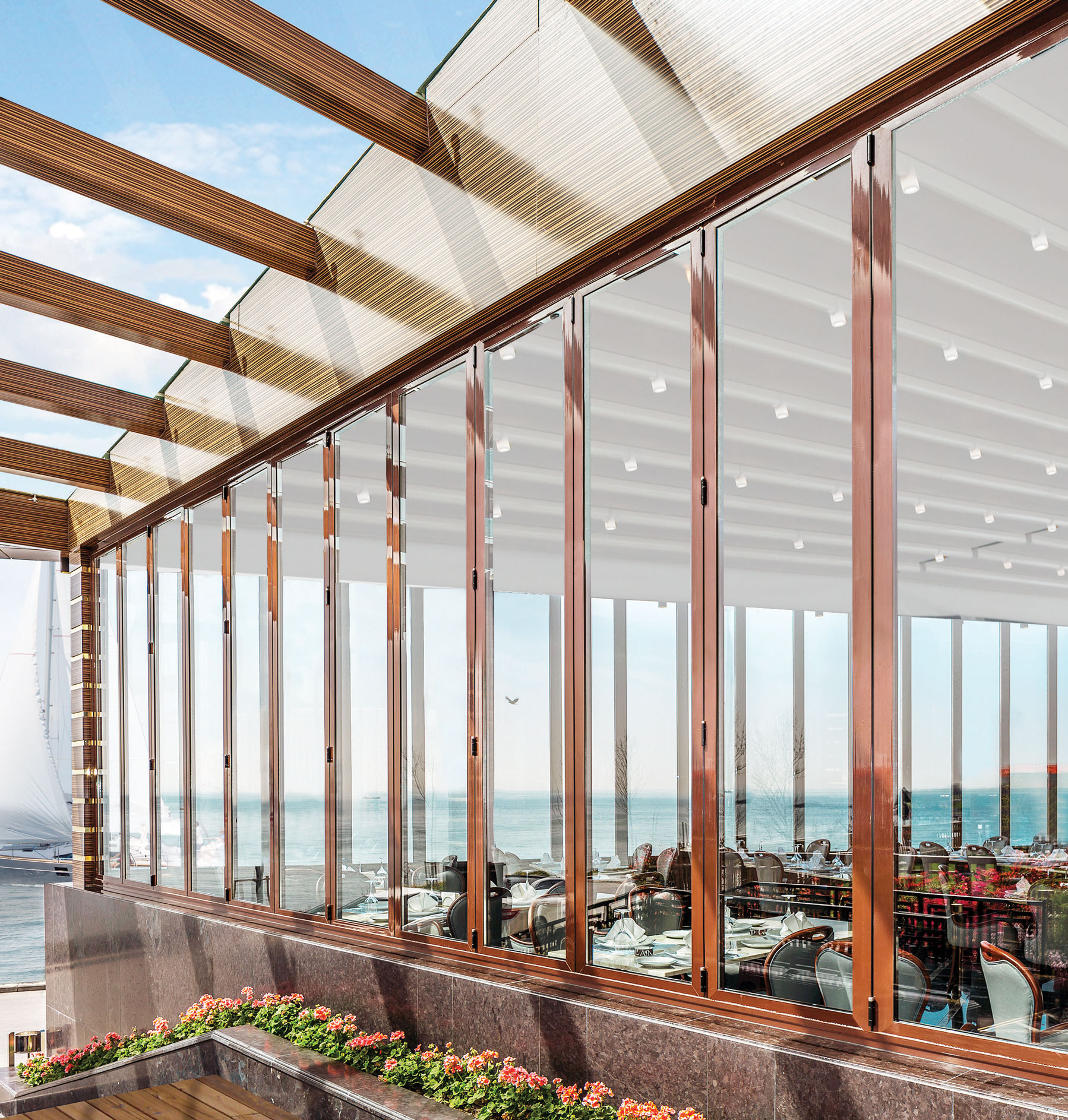 Zárt állapotban tökéletes víz-, szél- és hőszigetelést biztosít, a hatalmas panelek megszakítás nélküli kilátást tesznek lehetővé.